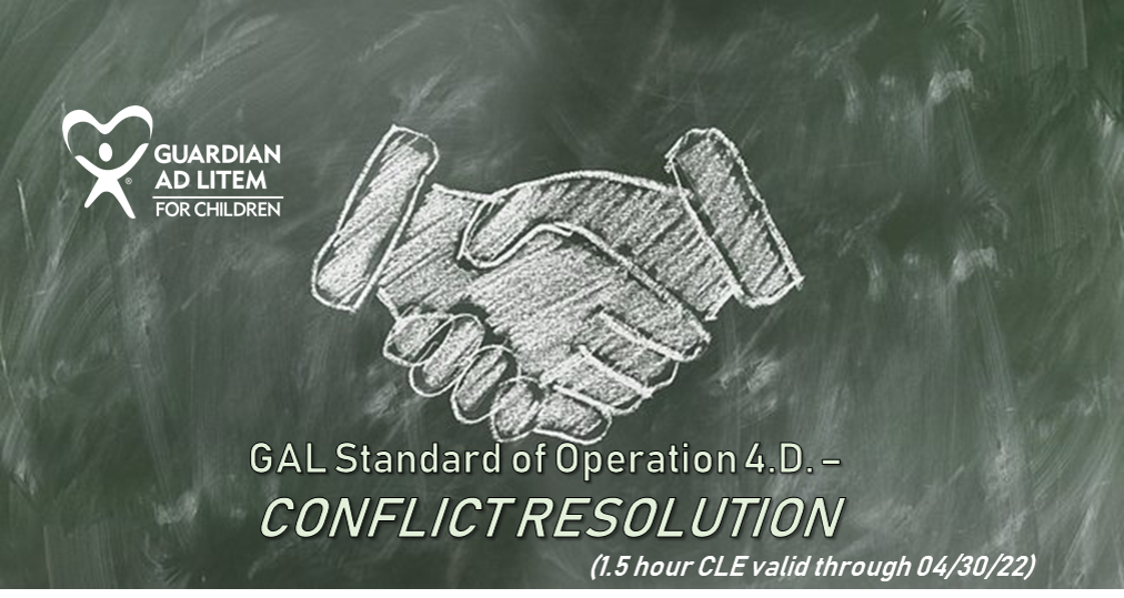 This presentation provides valuable information for all staff regarding the application of GAL Standard 4.D. - Conflict Resolution. This standard is used in team meetings and staffings to facilitate reconciliation of differences of opinion and/or conflict in case issues and Program recommendations.